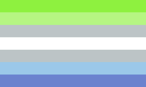 this is my personal gender flag. the greens and grey come from the agender flag and the blues come from the bigender flag (which the whole thing is based on)
